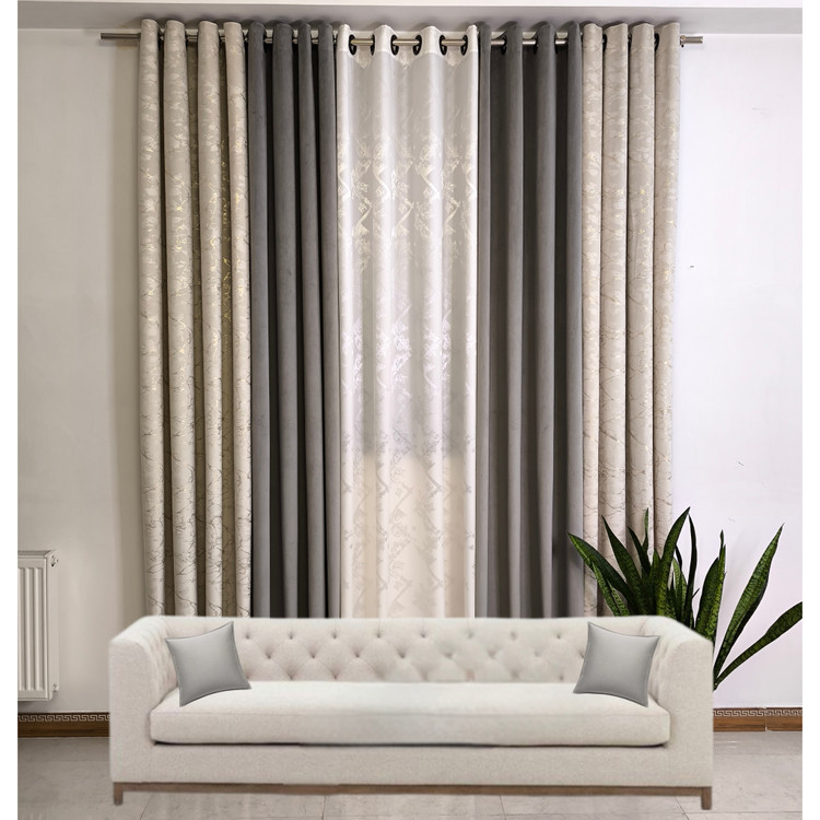 این پک شامل ۵ تیکه پرده آماده پانچی ۲ تکه مخمل طلاکوب ۲ تکه مخمل کالیفرنیا و یک تکه کرپ محو ابری