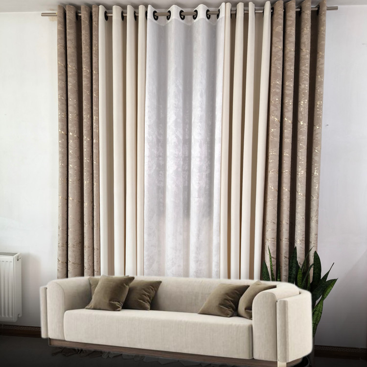 این پک شامل ۵ تیکه پرده آماده پانچی ۲ تکه مخمل طلاکوب ۲ تکه مخمل کالیفرنیا و یک تکه کرپ محو ابری