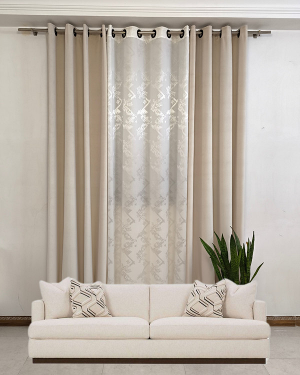 این پک شامل ۳ تیکه پرده آماده پانچی ۲ تکه مخمل کالیفرنیا وارداتی و ۱ تکه کرپ محو ابری